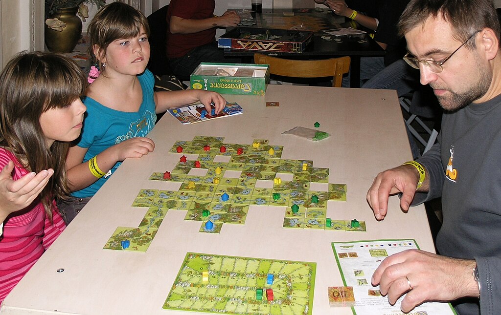 Carcassonne is a tile placement game in which the players draw and place a tile with a piece of southern French landscape represented on it. The tile might feature a city, a road, a cloister, grassland or some combination thereof, and it must be placed adjacent to tiles that have already been played, in such a way that cities are connected to cities, roads to roads, et cetera. Having placed a tile, the player can then decide to place one of their meeples in one of the areas on it: in the city as a knight, on the road as a robber, in the cloister as a monk, or in the field as a farmer. When that area is complete that meeple scores points for its owner.