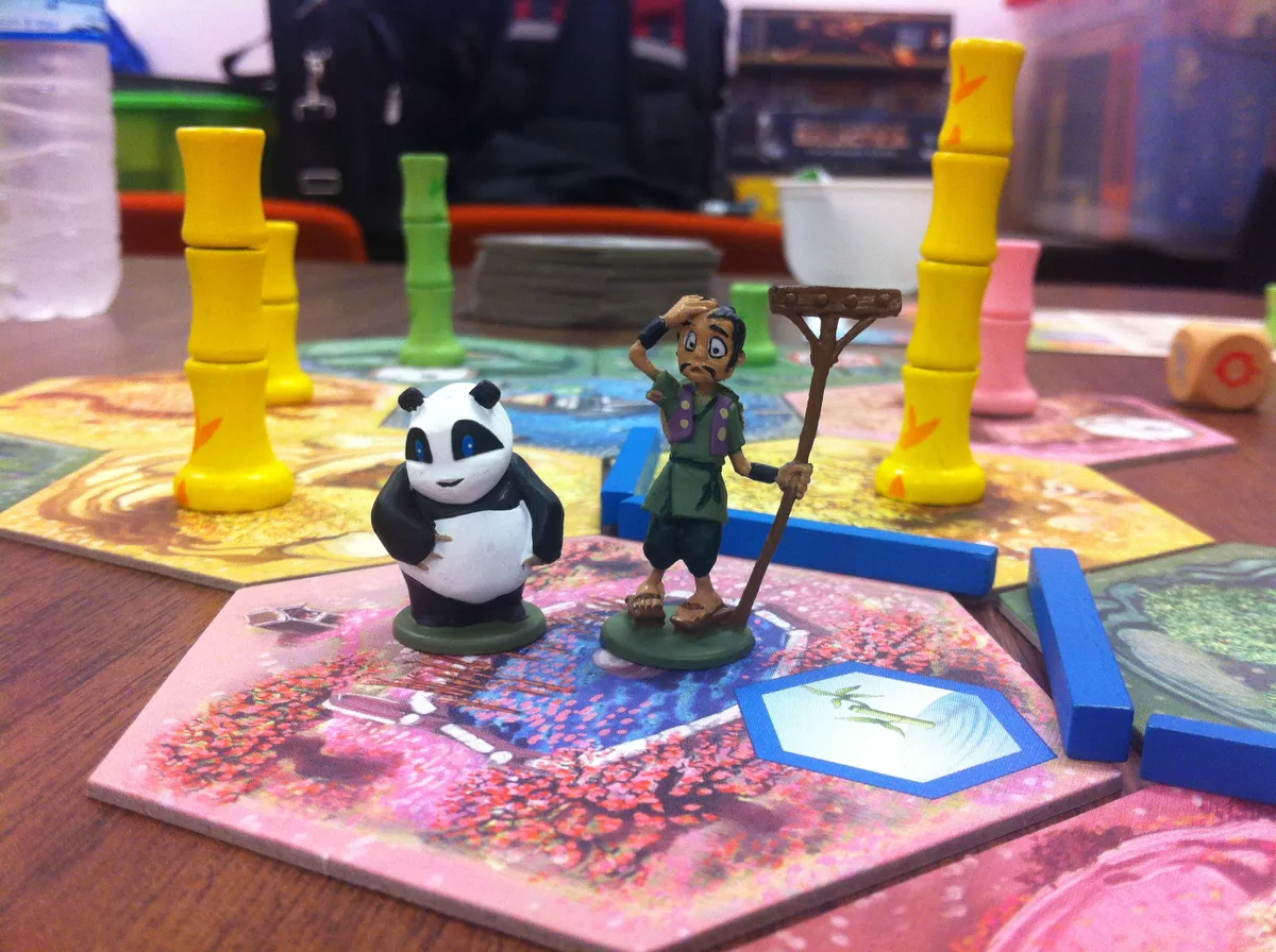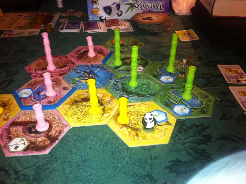 In Takenoko, the players will cultivate land plots, irrigate them, and grow one of the three species of bamboo (Green, Yellow, and Pink) with the help of the Imperial gardener to maintain this bamboo garden. They will have to bear with the immoderate hunger of this sacred animal for the juicy and tender bamboo. The player who manages his land plots best, growing the most bamboo while feeding the delicate appetite of the panda, will win the game.